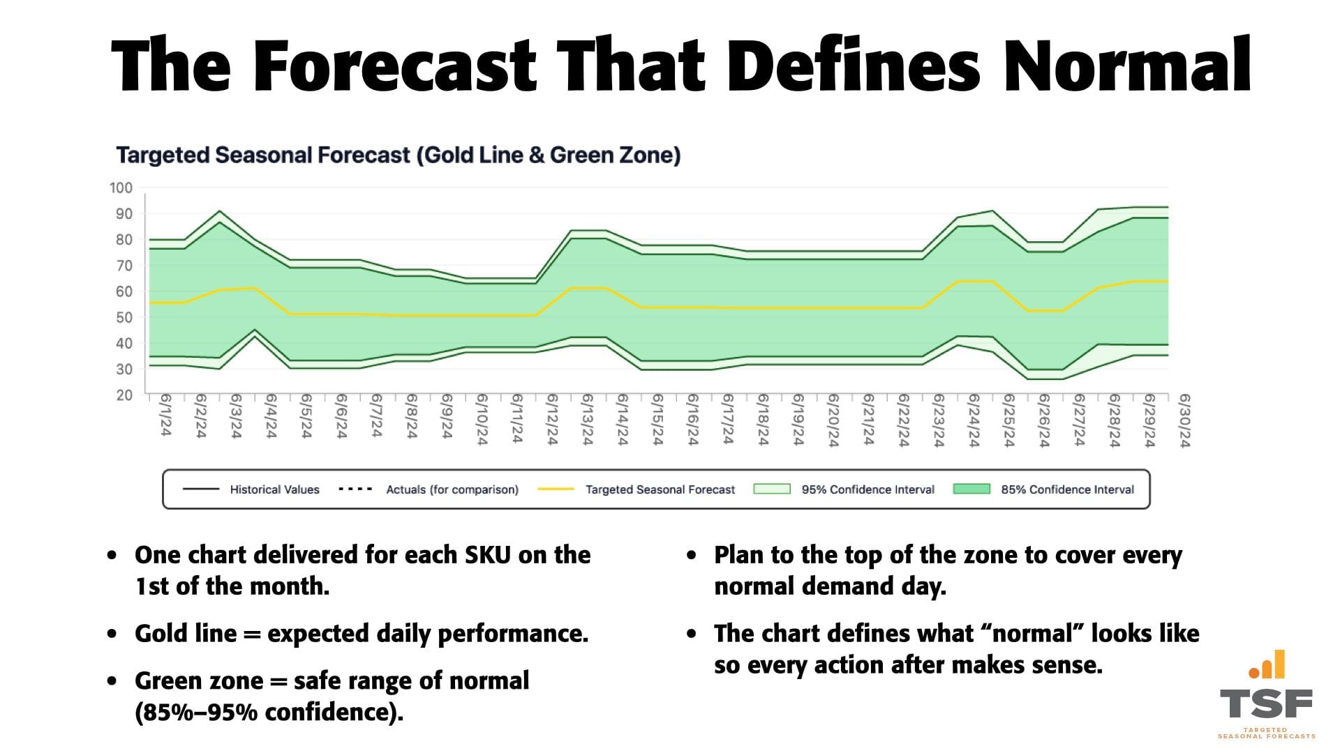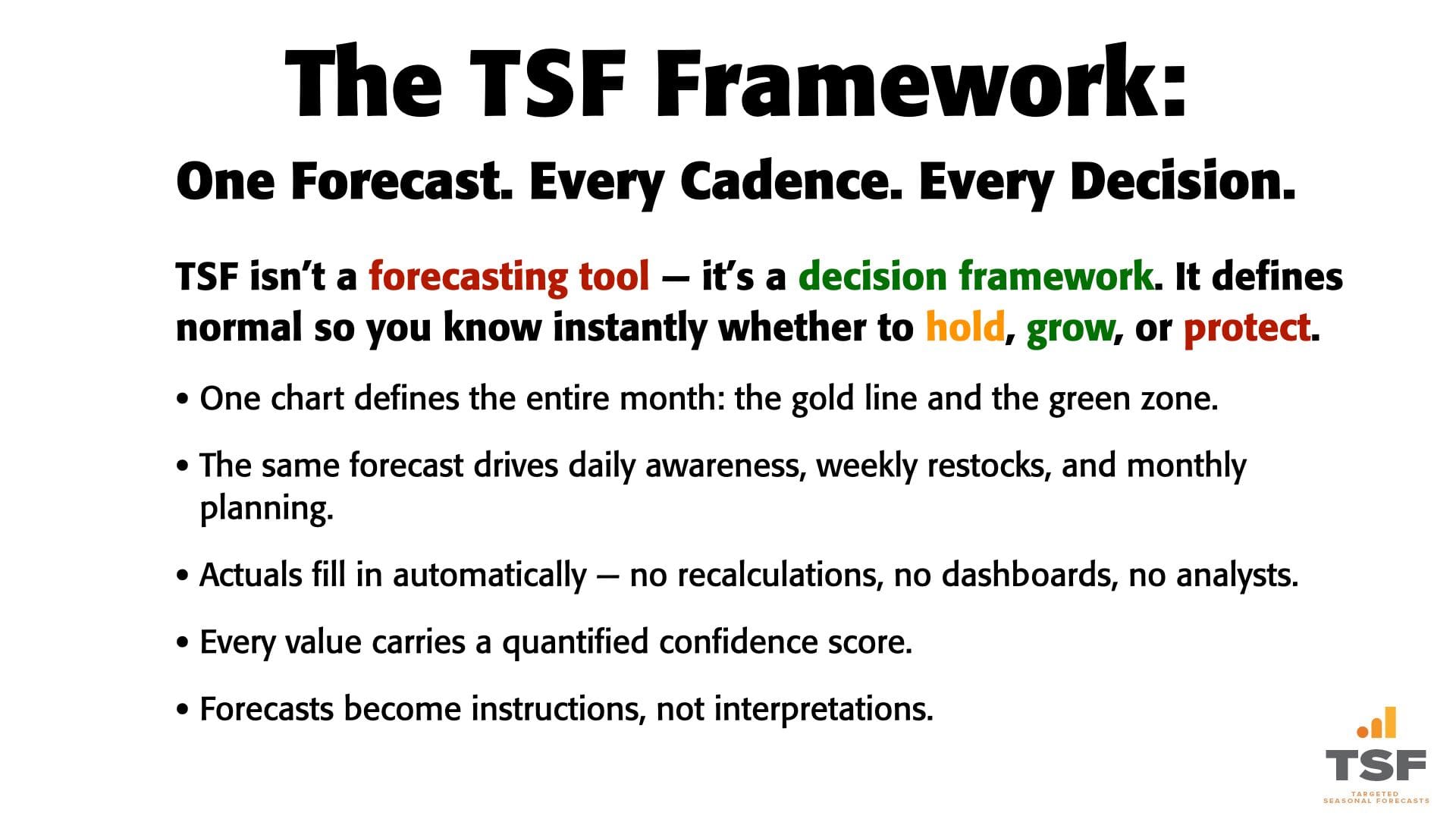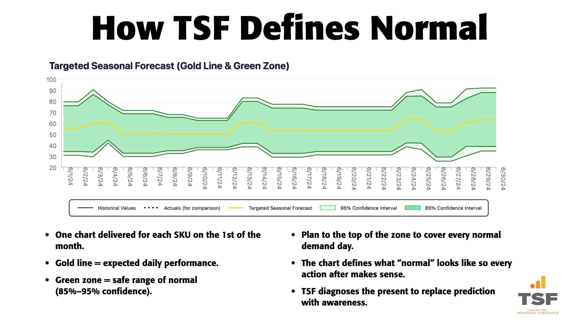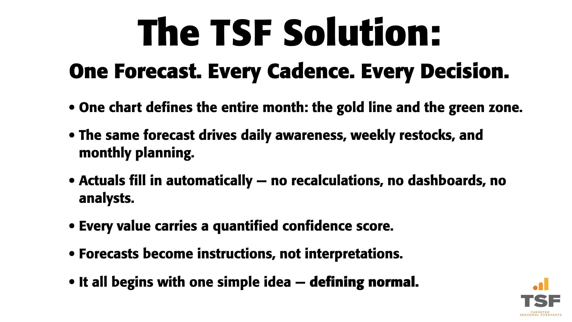 Built on seven years of original research, TSF replaces prediction with proof—defining what’s normal for every SKU, every month. Merchants and agencies plan inside the band, not against a guess.