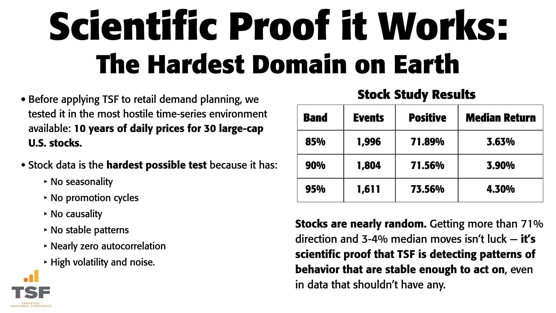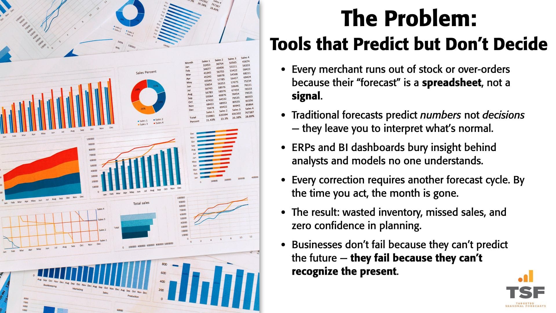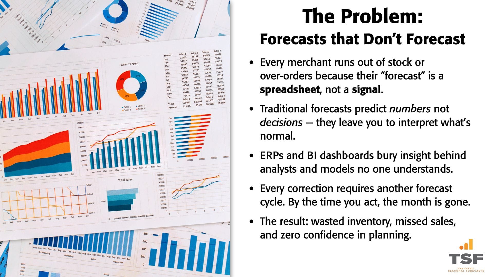 Built on seven years of original research, TSF replaces prediction with proof—defining what’s normal for every SKU, every month. Merchants and agencies plan inside the band, not against a guess.