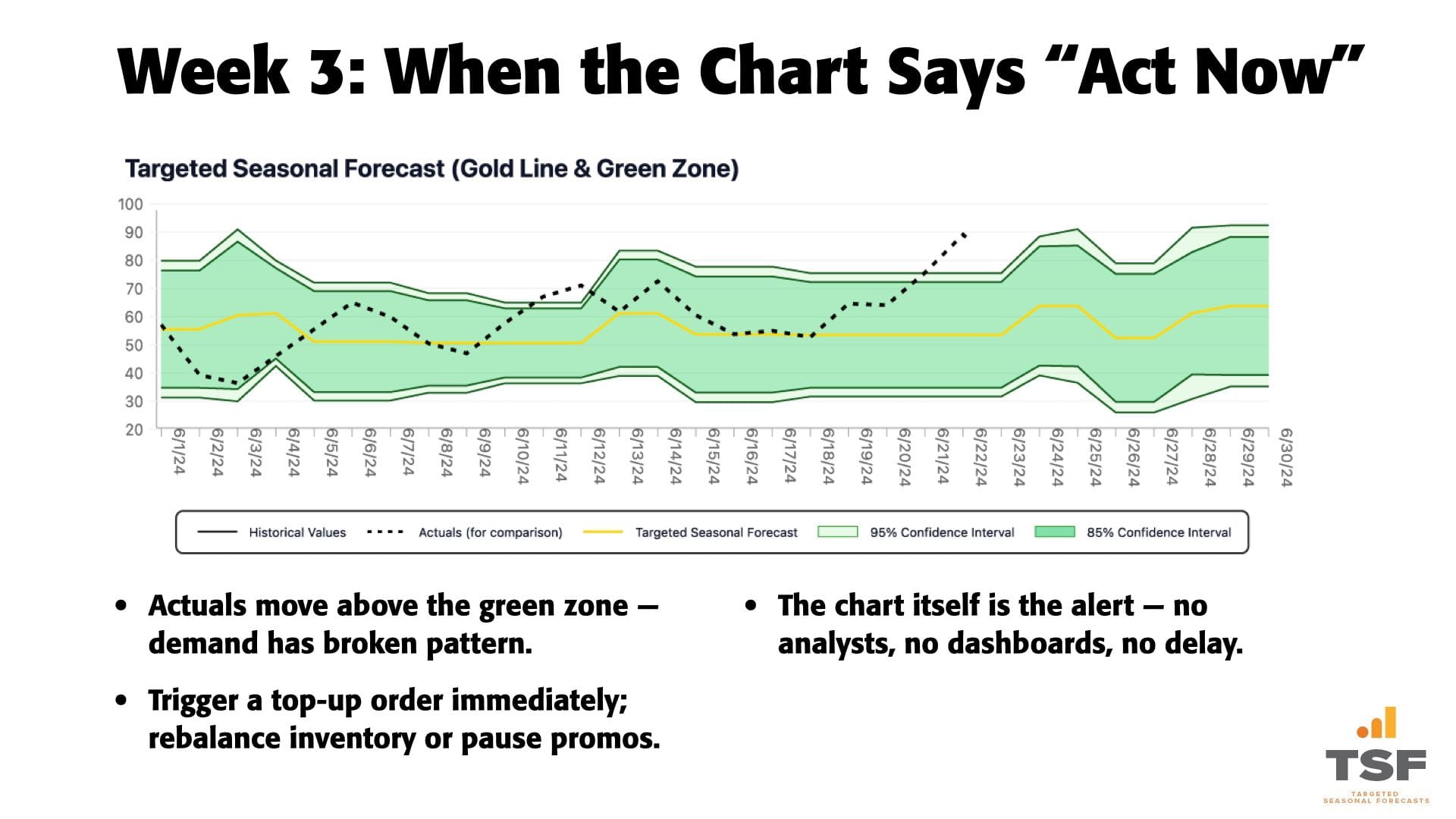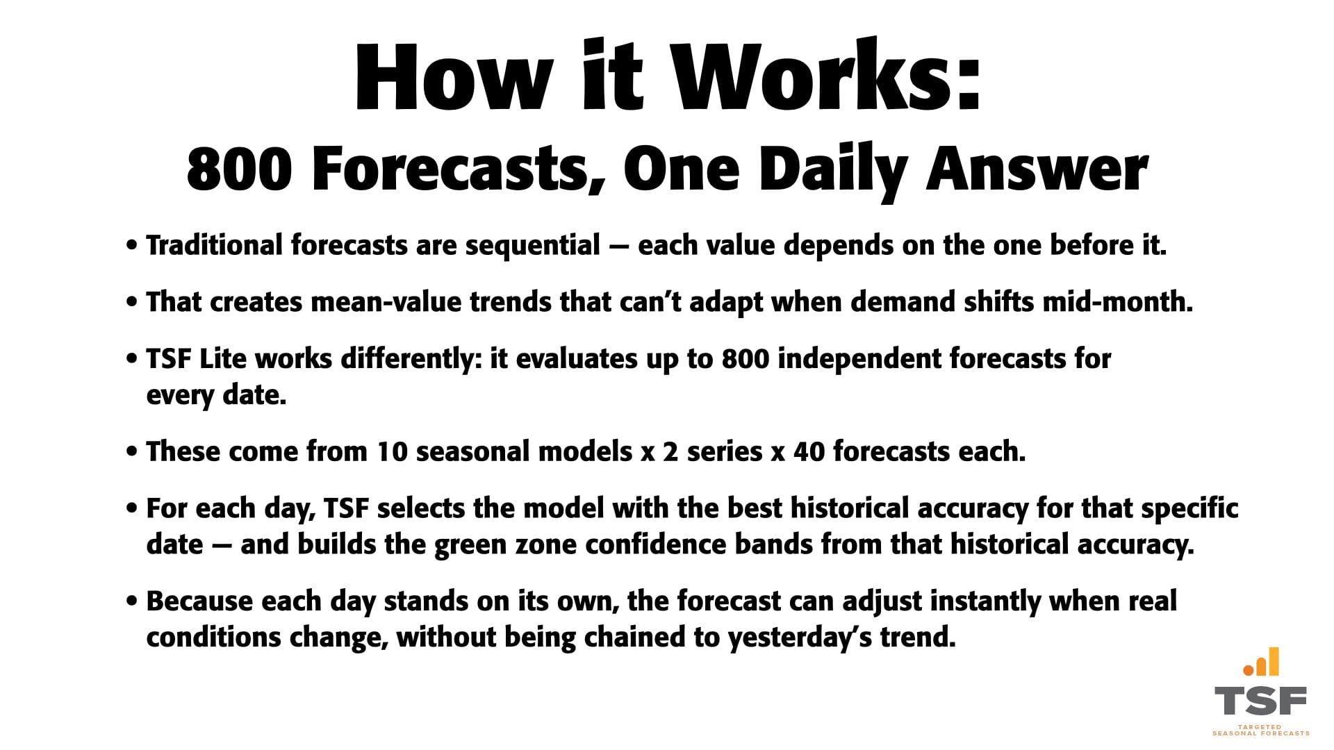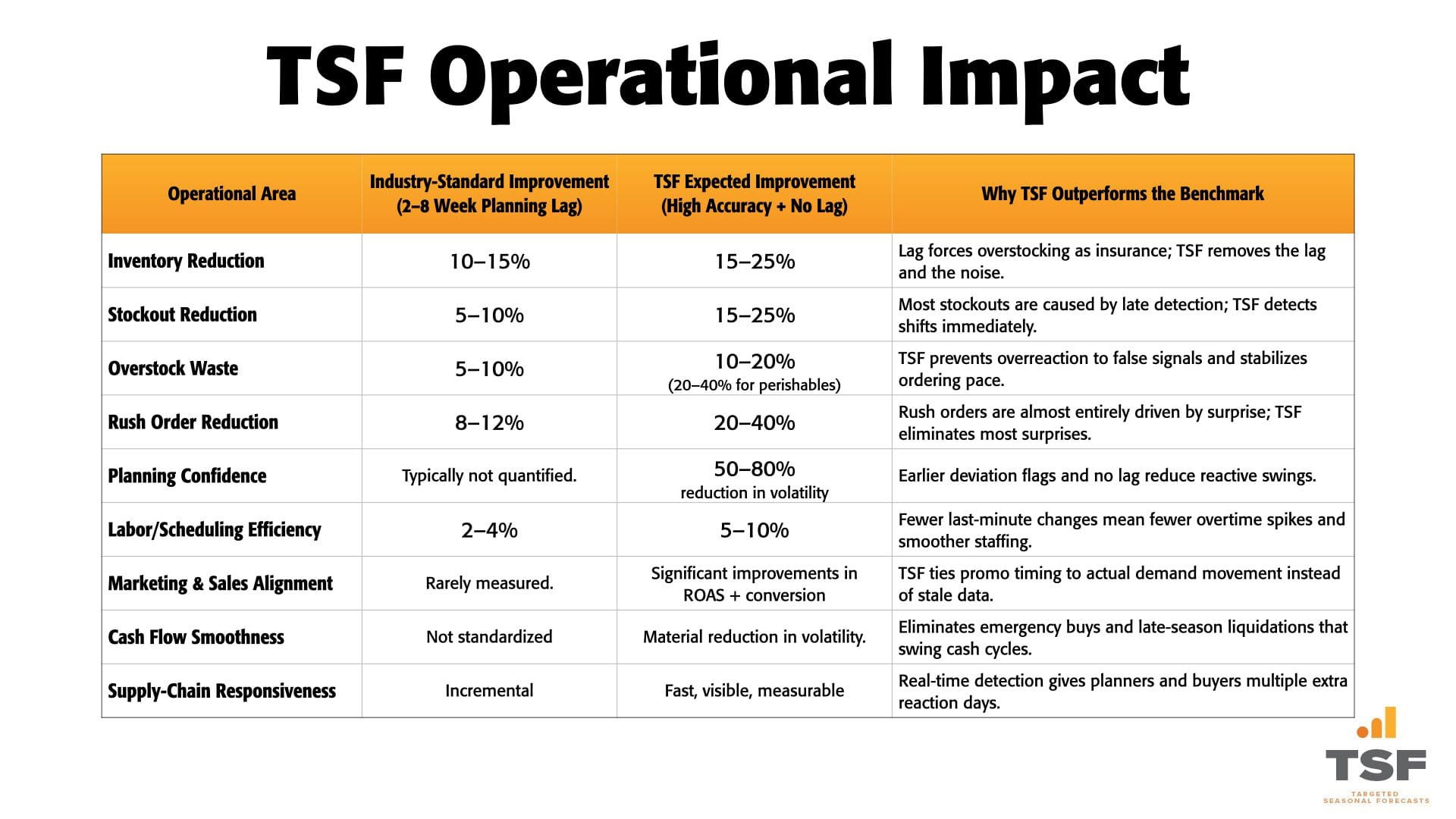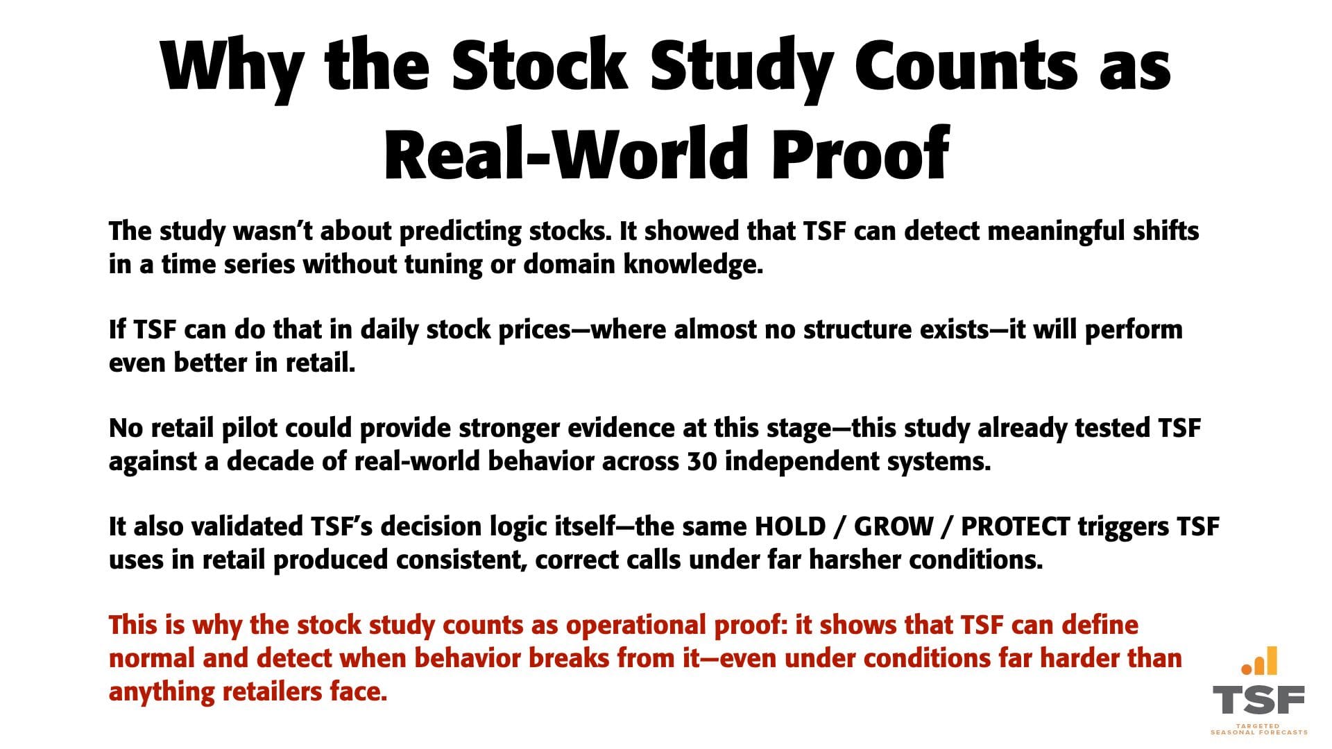 Built on seven years of original research, TSF replaces prediction with proof—defining what’s normal for every SKU, every month. Merchants and agencies plan inside the band, not against a guess.