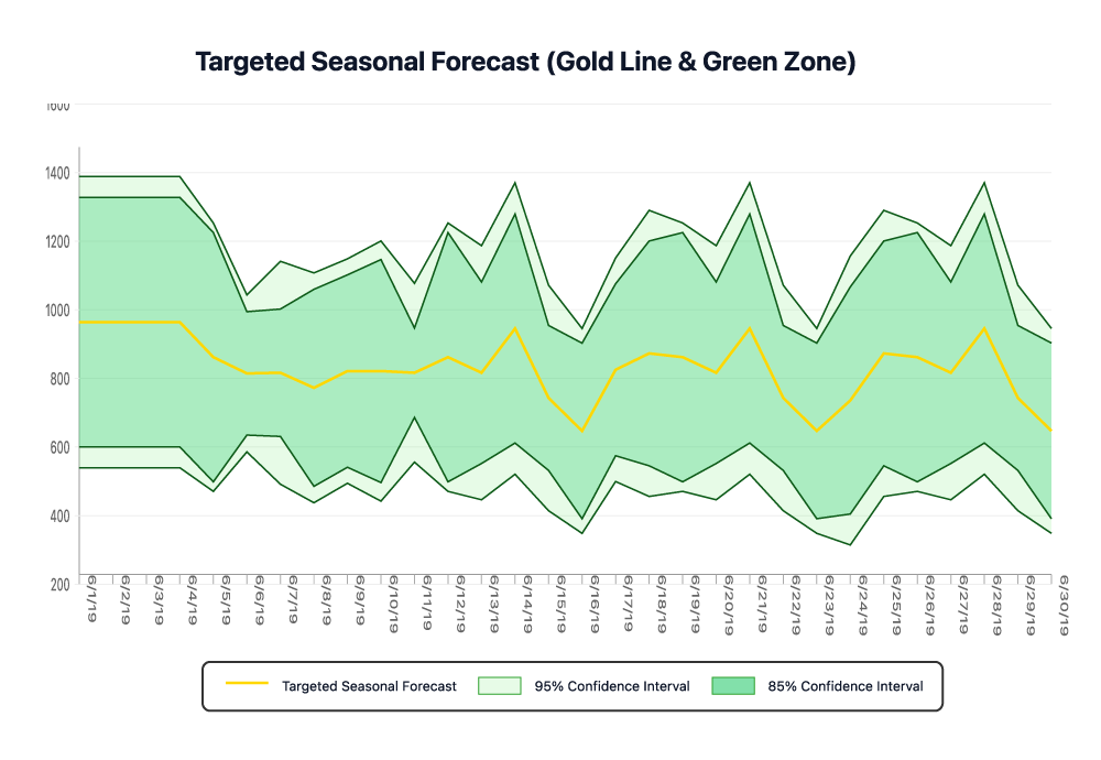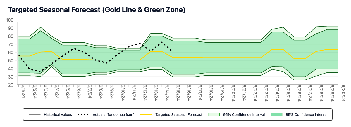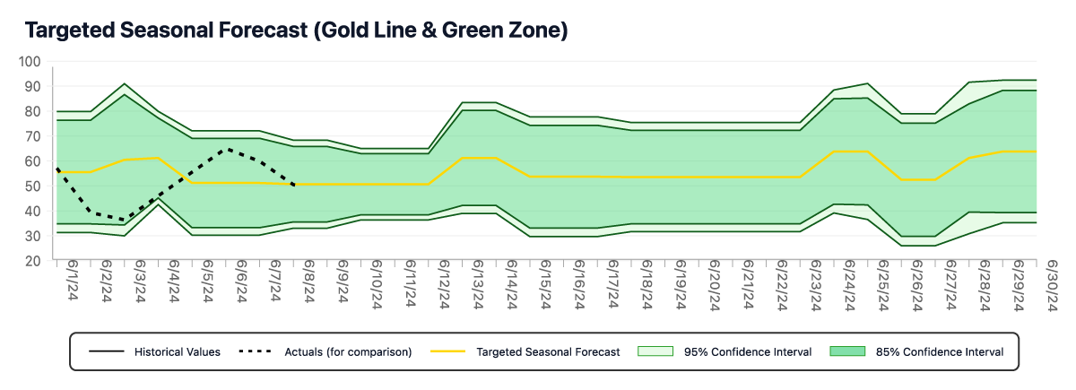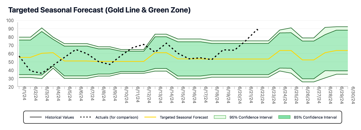 The gold line is the expected daily performance for the month ahead. Each point represents one day’s forecasted sales. The surrounding green zone shows the range of results that are still considered normal — the inner band (85%) for day-to-day operations and the outer band (95%) for high-confidence planning.